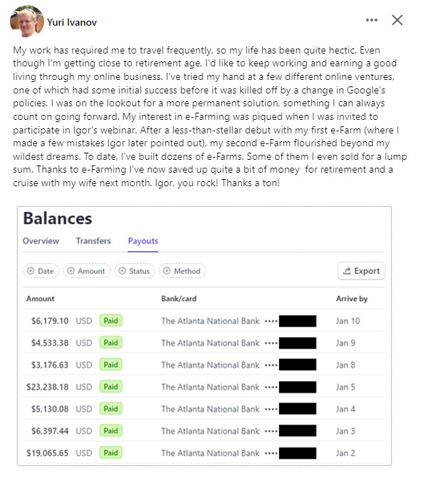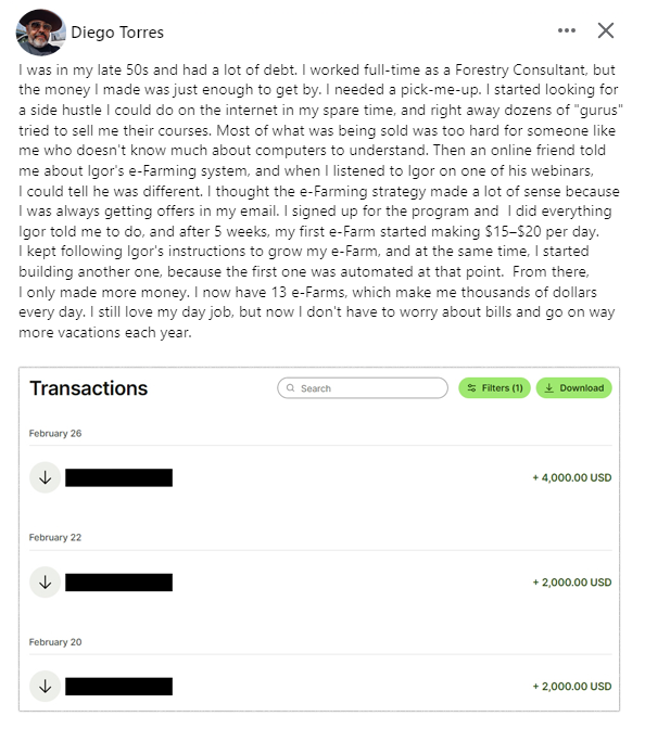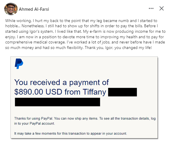 Within 6 months, e-Farming income surpassed his forklift earnings for six months, working only 10-12 hours per week.