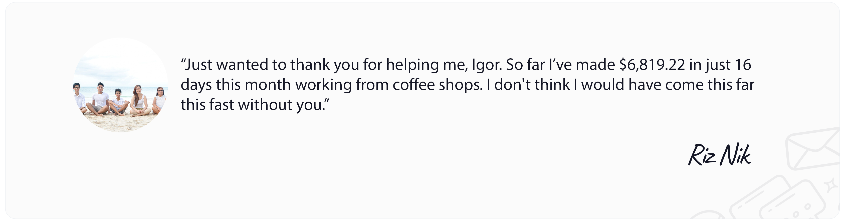My chief support officer Olivia can handle nearly every question about your first affiliate campaign because I personally trained her. Expect fast replies to your emails with specific “do this, do that” advice. Promise - no ambiguity or sending you on another wild goose chase.