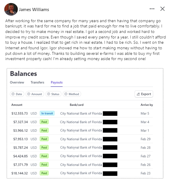 Within 6 months, e-Farming income surpassed his forklift earnings for six months, working only 10-12 hours per week.
